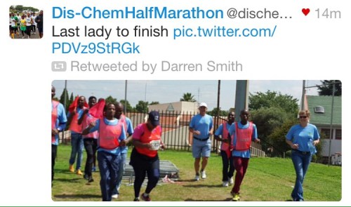 Dischem Half Marathon tweeted a picture of the last lady finishing the race. Alongside her is a crowd of supporters, cheering her on, running the last km with her. That tweet was followed by so many well wishes and words of encouragement from so many people, including one from Jenna Challenor, who finished the race in 2nd position. It touched my heart! What an awesome message!